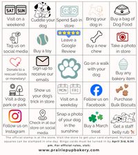 Promotion open to in-store participants only. Prizes must be redeemed in person at Prairie Pup Bakery. Open to customers 18 years or older. One Bingo card per household.